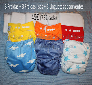 3 Fraldas lisas + 3 Fraldas padrão + 6 linguetas absorventes 45€ (fica a 7,50€ cada)